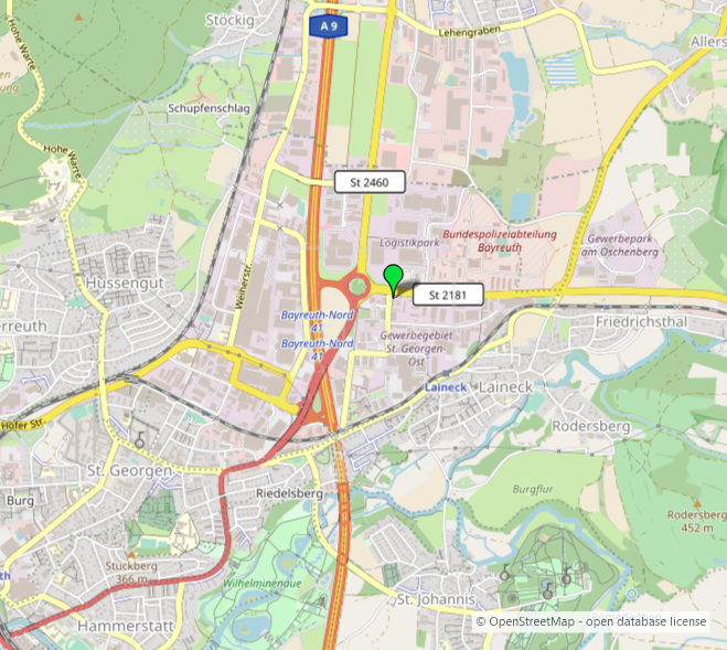 Das Grundstück befindet sich in direkter Autobahnnähe im Gewerbegebiet St. Georgen Ost - sie ist von der Autobahnanschlussstelle Nord und ebenso von allen nördlich und östlich liegenden Gemeinden wie Bindlach, Goldkronach, Bad Berneck und Weidenberg optimal erreichbar. Die Anschlussstelle A9 Nord liegt in Sichtweite und ist in nur 1 Minute erreichbar.