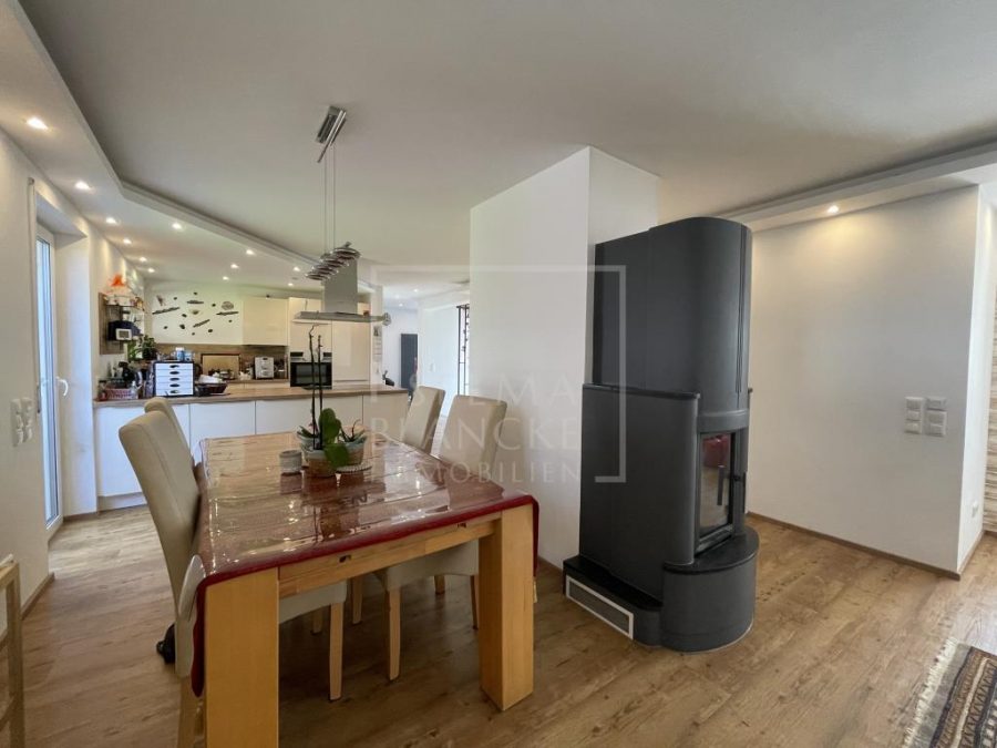 Für den barrierefreien Umbau des Erdgeschosses wurden viele Zwischenwände entfernt, der Wohn- und Essbereich damit geöffnet und vergrößert, nahezu alle Fenster ausgetauscht, das Badezimmer komplett erneuert, der gesamte Boden schwellenlos neu ausgelegt, alle Elektroinstallationen erneuert sowie die Heizung neu verlegt. Für die Gemütlichkeit im Haus sorgt die offene und moderne Einbauküche mit angrenzender Essecke und der großzügige Schwedenofen. Weiterhin wurde eine gemauerte Rampe für einen rollstuhlgerechten Zugang zur Terrasse geschaffen.