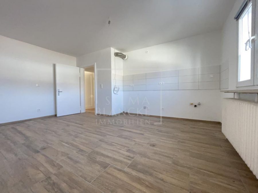 Die schöne Wohnküche ist mit etwa 16 m² sehr geräumig und bietet ausreichend Platz für einen Esstisch oder für eine moderne Eckbank. Der Bereich für die Einbauküche ist mit einem neuen Fliesenspiegel ausgestattet und ist für eine EBK mit einer Länge von ca. 2,80 Meter ideal geeignet.